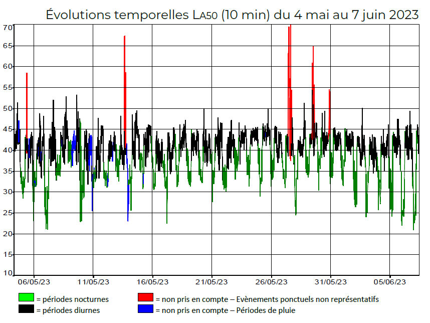 L’étude acoustique a pour but de mesurer l’environnement sonore actuel, de simuler la contribution des éoliennes afin de vérifier le respect de la réglementation en vigueur. Celle-ci impose des émergences sonores à ne pas dépasser : 5 dB(A) en période diurne et 3 dB(A) en période nocturne. Le graphique ci-dessous illustre les résultats des mesures acoustiques réalisées en mai 2023 sur l’un des 15 points de mesures.